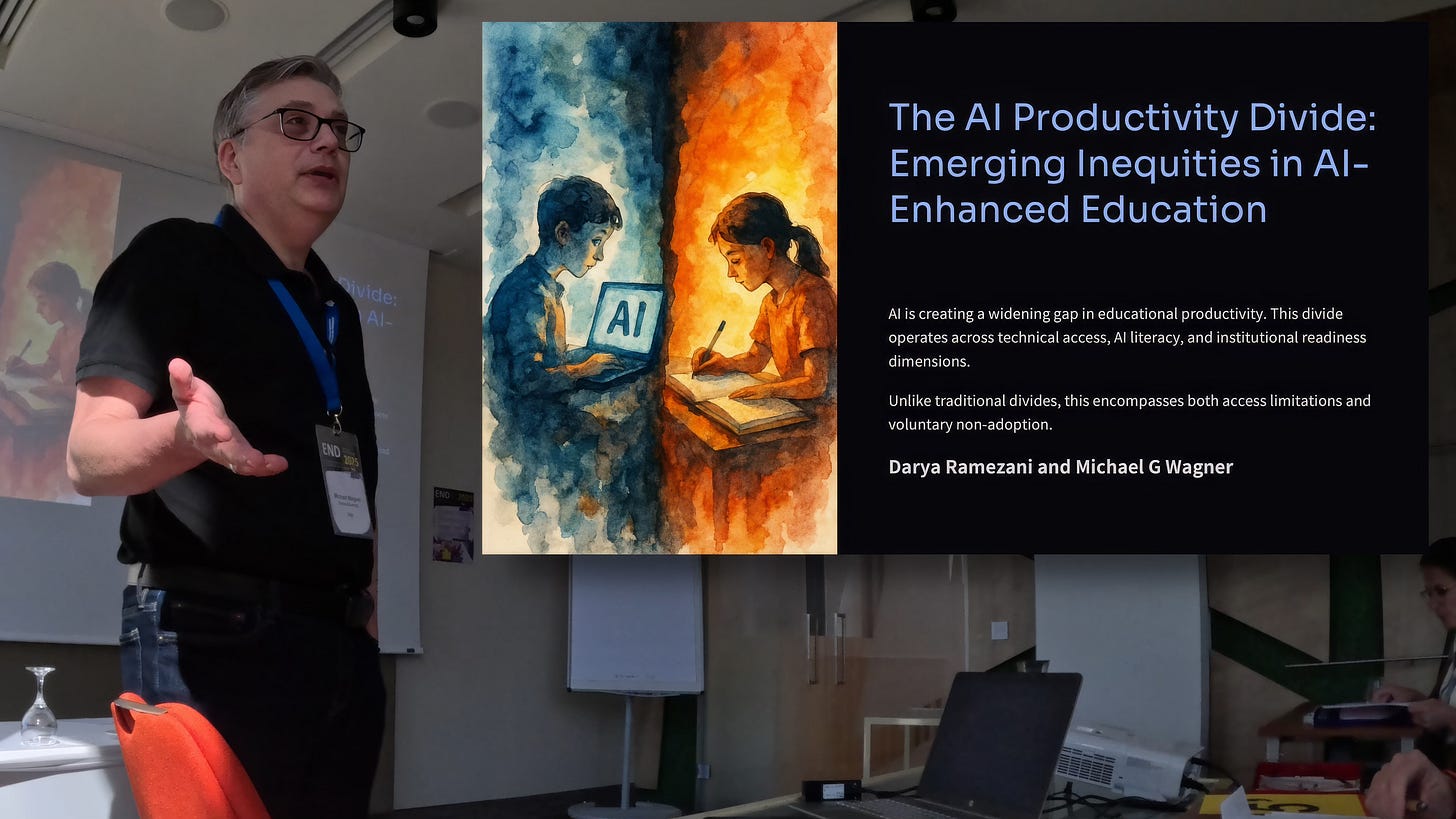 Also authored primarily by Darya and presented by me at END 2025 in Budapest, this research identifies a new form of digital divide emerging in education. Unlike the traditional digital divide’s focus on access and skills, the productivity divide centers on the disparity in outcomes between students using AI effectively and those who aren’t. Drawing from our teaching experiences, where AI-proficient students created work of unprecedented quality not by using AI as a shortcut, but by using it to go beyond standard requirements, this research reveals how AI can amplify existing inequalities.