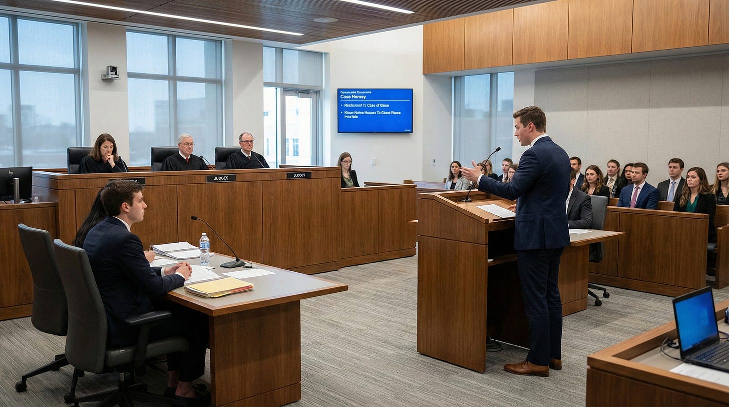 The second structure is the adversarial simulation, most fully developed in legal education through the Moot Court. Unlike the OSCE, which strives for neutrality, the Moot creates conflict by design. Students assume the role of appellate attorneys arguing a fictional case before judges who actively challenge their reasoning. The assessment is not just the prepared argument but the capacity to respond to hostile questioning—to maintain composure when a judge exposes a weakness in the case, to acknowledge limitations while pivoting to stronger ground, and to think on one’s feet when the expected line of questioning fails to materialize. This architecture works best when the goal is to assess resilience under pressure and the ability to sustain coherent argumentation against opposition.