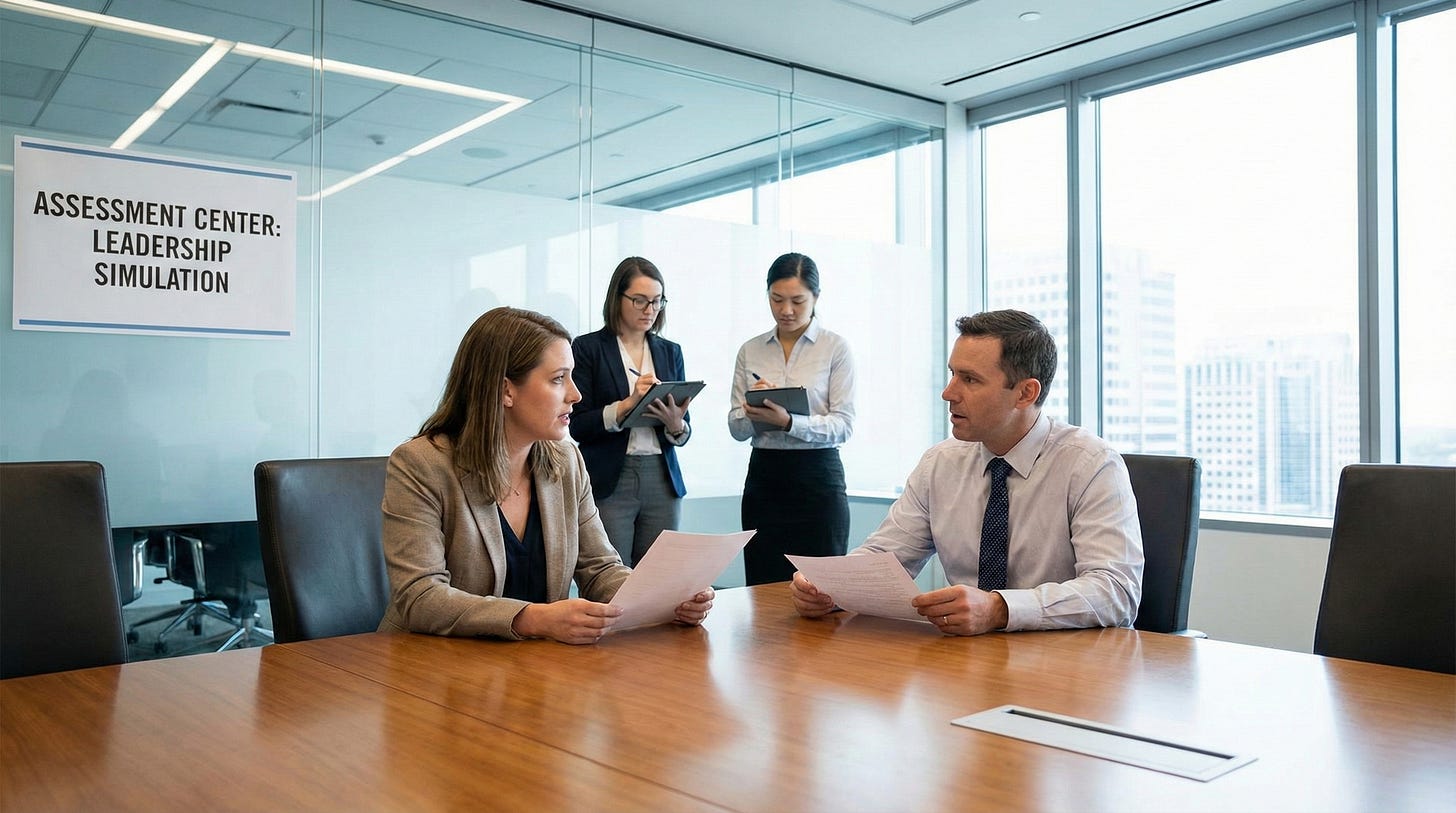 After the war, these techniques migrated to the corporate world. AT&T’s landmark Management Progress Study in 1956 formalized what would become the Assessment Center method: a multi-day evaluation where candidates participated in business games, in-basket exercises, and role-plays designed to reveal competencies that interviews and tests could not detect. The innovation was methodological rigor. AT&T developed Behaviorally Anchored Rating Scales that moved assessment away from vague impressions toward specific observable behaviors.